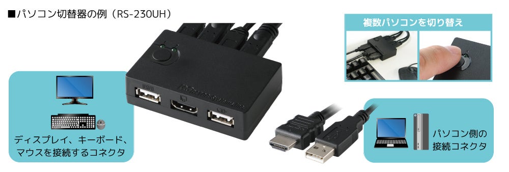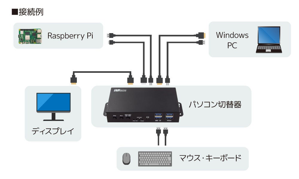 Windows PCとRaspberry Pi、MacとRaspberry Pi間で、HDMIディスプレイやUSB機器(キーボード、マウスなど)をスムーズに切り替えて共用することができます。