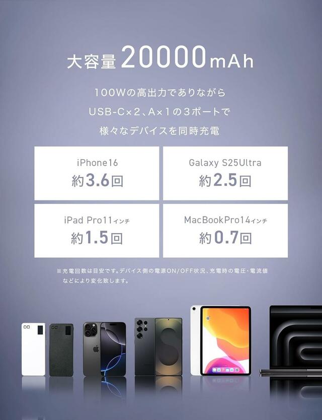 本商品は最大100Wの出力に対応しており、スマホはもちろん、MacBookなどのノートパソコンも充電が可能。容量も20,000mAhと大きいので、スマホなら複数回フル充電ができ、出張や旅行、防災用としても安心感があります。