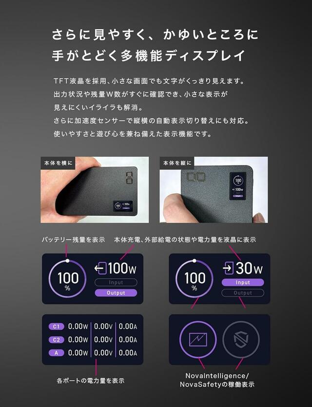 使いやすさをさらに高めているのが、リアルタイム表示に対応したディスプレイ。1%単位でのバッテリー残量はもちろん、各USBポートの出力状況や、自動振り分け機能・安全保護機能の動作まで確認できるので、今どれくらい電力が使われているかがすぐわかるのが魅力です。