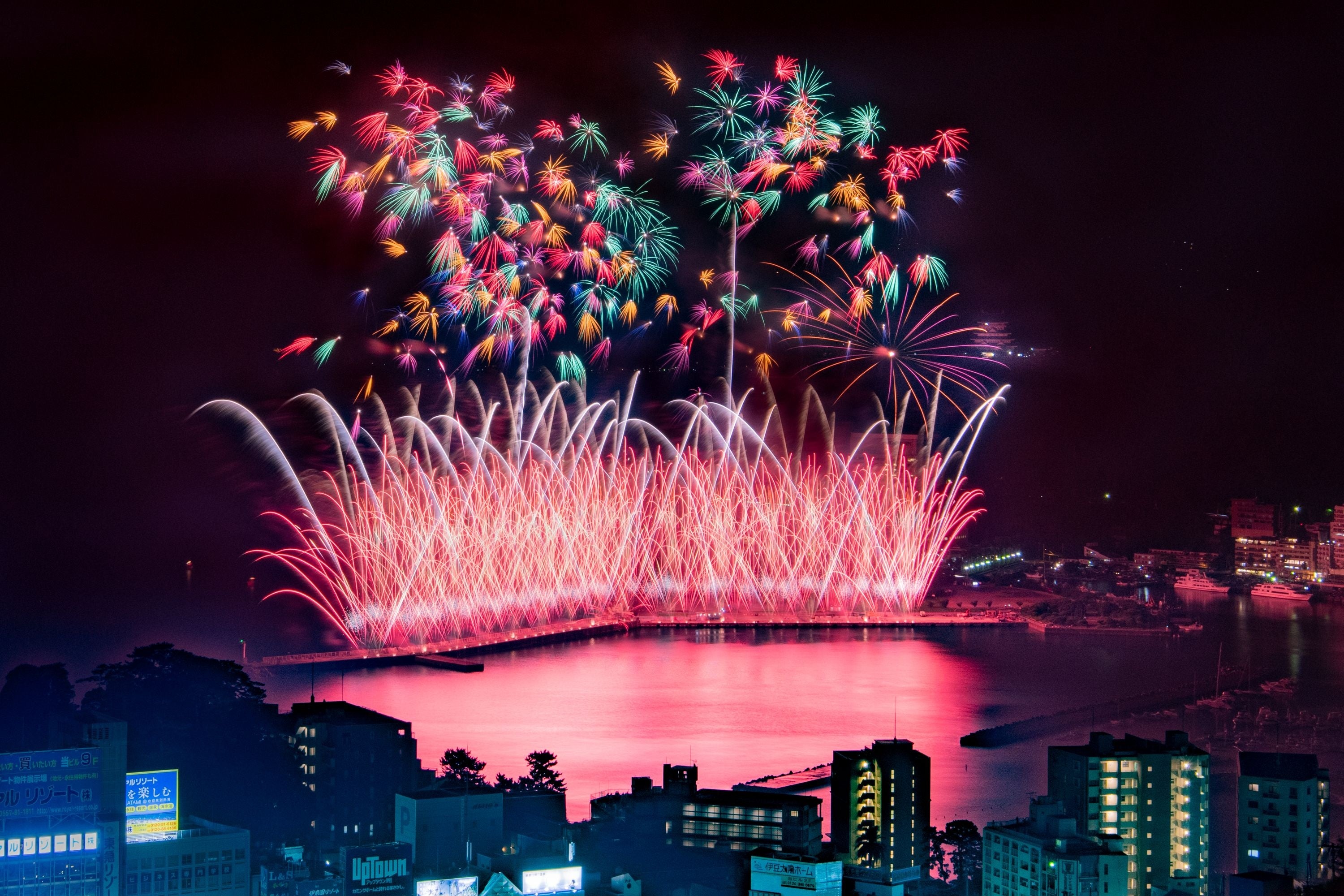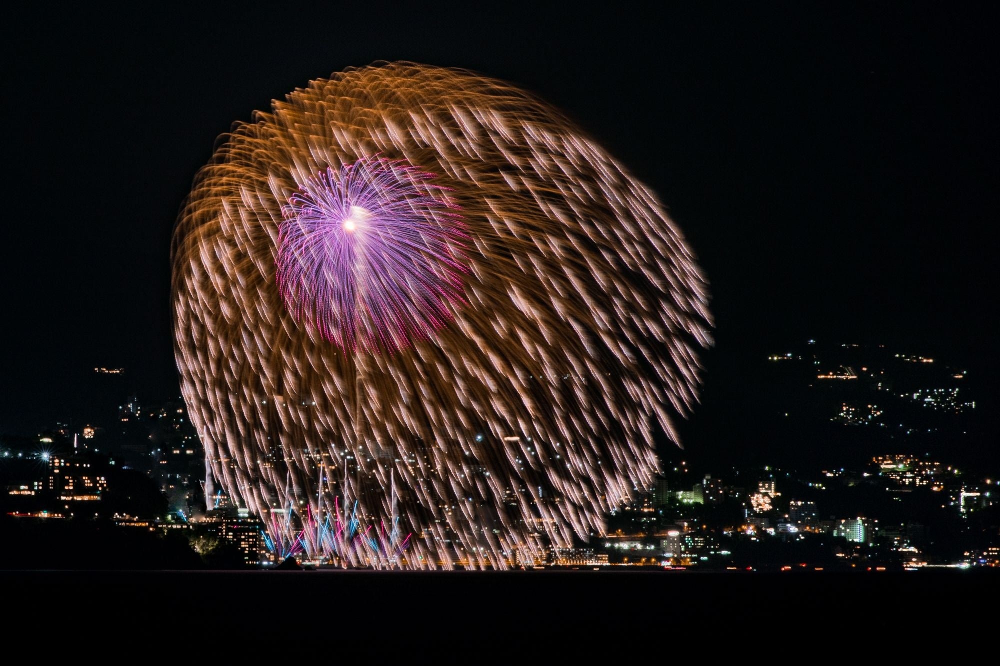 熱海海上花火大会は、昭和27年から開催しており2025年(令和7年)夏で74年目を迎えます。昭和24年8月31日「キティー台風」による高波で海岸地区140戸あまりの家屋が流失する災害、そして翌昭和25年には「熱海駅前火災」、更に10日後には中心街の979戸が焼失した大火に見舞われ、その後の復興に向け、地元市民による努力が続きました。街の復興とその努力に報いるべく、昭和27年に花火を打ち上げたのが始まりです。以来その伝統が受け継がれ、今では一年を通して開催しており、熱海の代名詞となりつつあります。