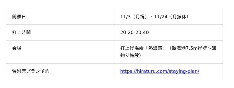 秋の行楽シーズンを迎える11月熱海海上花火大会が開催。特等席確約の送迎付プラン販売中ですが、残り少なくなっているので、お早めのお申し込みを!