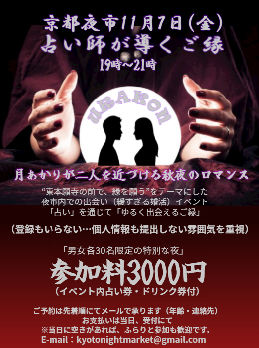 今回は、占いをテーマにした特別企画 『占KONナイト(うらこんナイト)』 を実施。“占いで始まる、ゆるやかな出会い”をコンセプトに、秋の京都らしい情緒あふれる夜を演出します。10月に京都市役所前広場で実施された特別開催では、来場者数12,000人を記録。累計来場者は5.7万人を超え、京都夜市は、京都のナイトカルチャーを象徴するイベントとして成長を続けています。