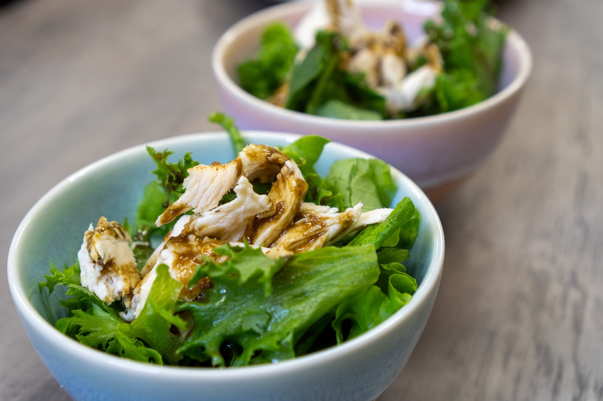 蒸し鶏のサラダ~黒糀のドレッシング~ 385円(税込)・どんな野菜も高級レストランの味になる黒糀ポン酢のドレッシング
