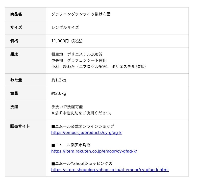 「身体に合った寝る・座る・たたむ」を提供する健康家具ブランドEMOORを展開する株式会社エムール(東京都立川市:代表取締役 高橋 幸司/以下エムール)は、2025年10月30日より「グラフェンダウンライク掛け布団」の販売を開始しました。