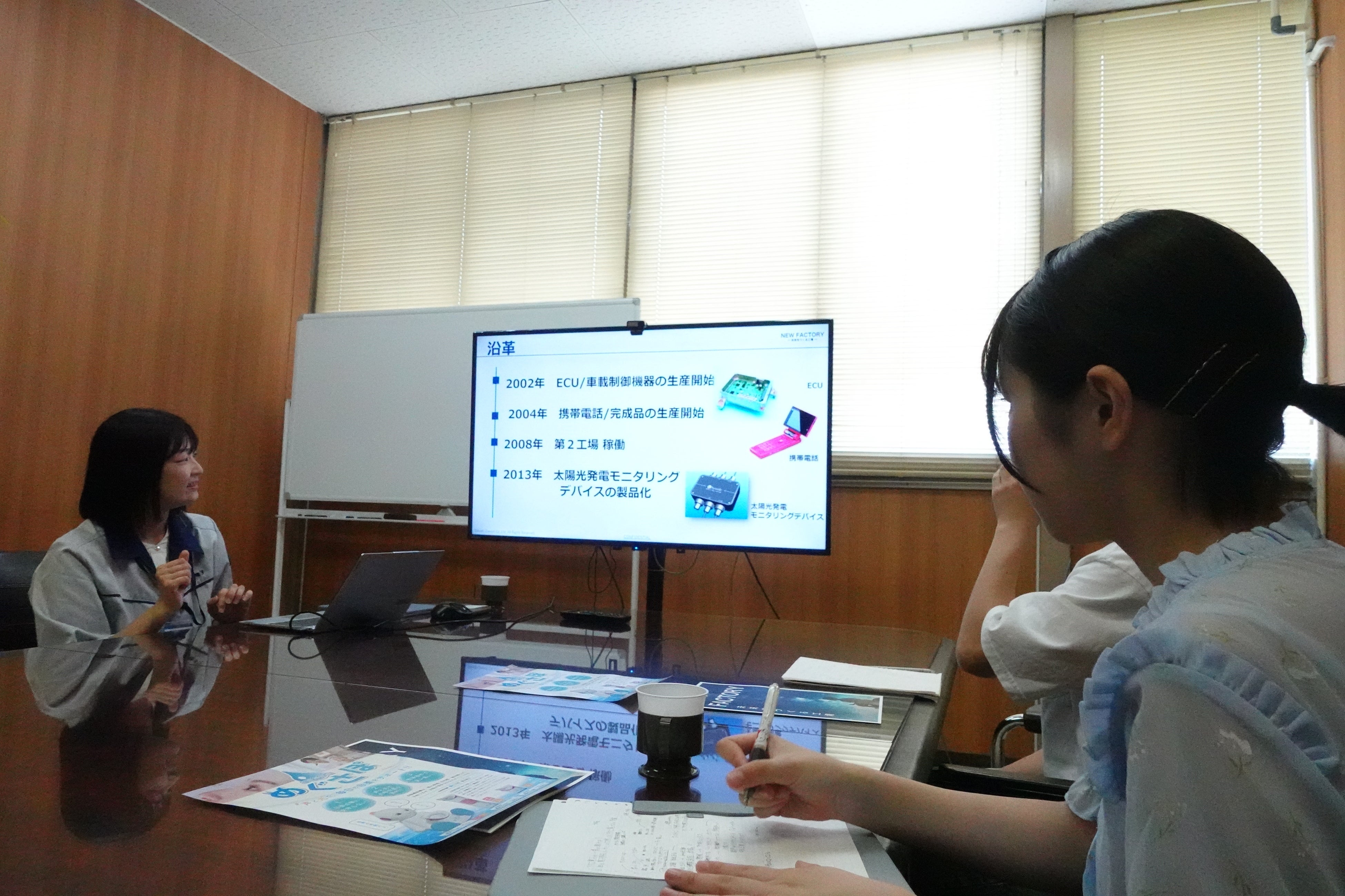 6月~7月には学生チームが県内企業を訪問し、企業の担当者や経営者などへのインタビューを実施しました。現場で直接話を聞くことで、実際の職場環境や社内の雰囲気、働く人々の想いや地域に根差した企業の魅力を掘り下げて理解。取材内容をもとに、学生自身の言葉で脚本を練り上げました。