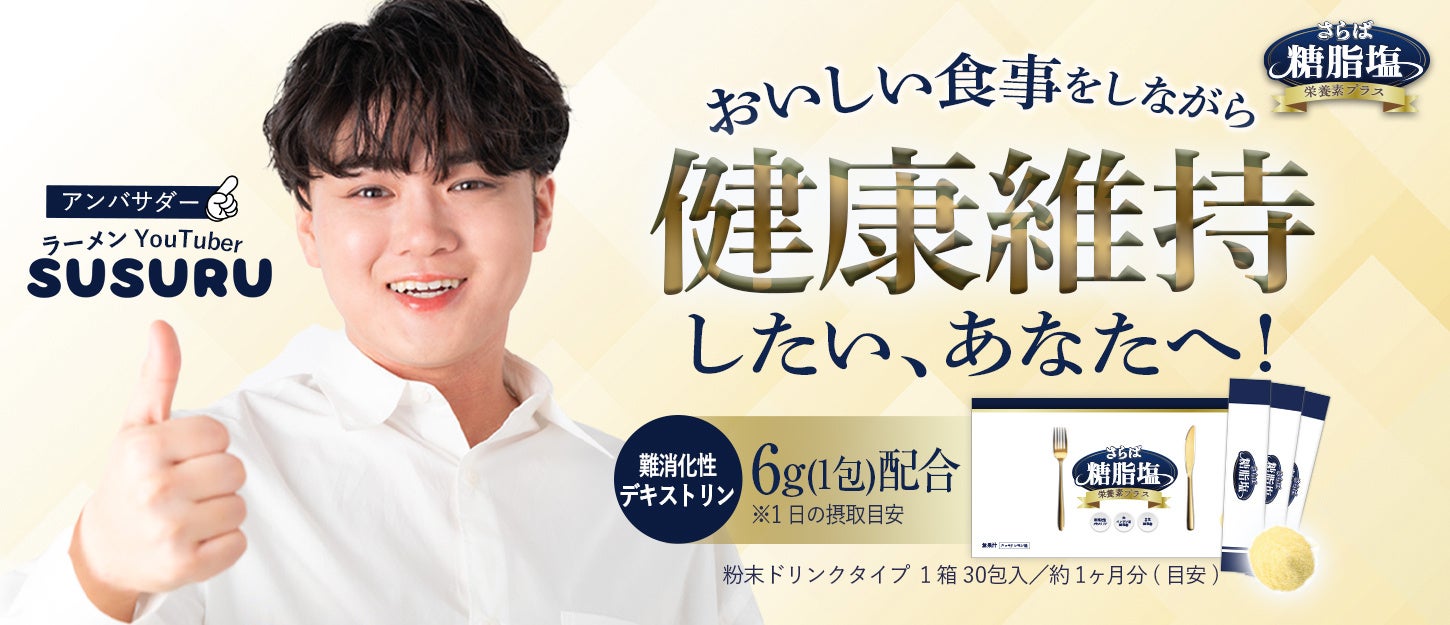 糖質・脂質・塩分をトリプルサポートするサプリメント「さらば糖脂塩」(販売元:株式会社LADDER)は、人気ラーメンYouTuber・SUSURUが主催する『SUSURUラーメンフェス青森』に協賛し、ブース出店いたします。