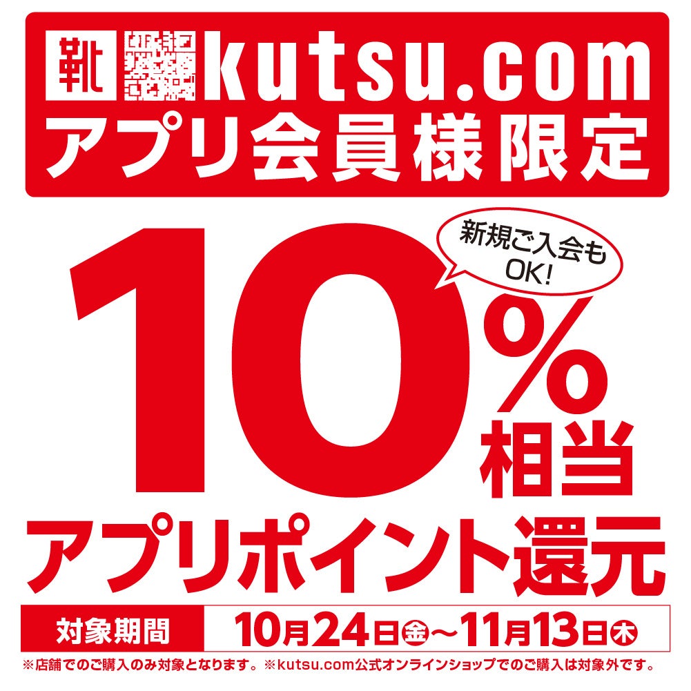【kutsu.comアプリ会員様キャンペーン】期間中、お買い上げ総額10%相当のアプリポイントを還元します!