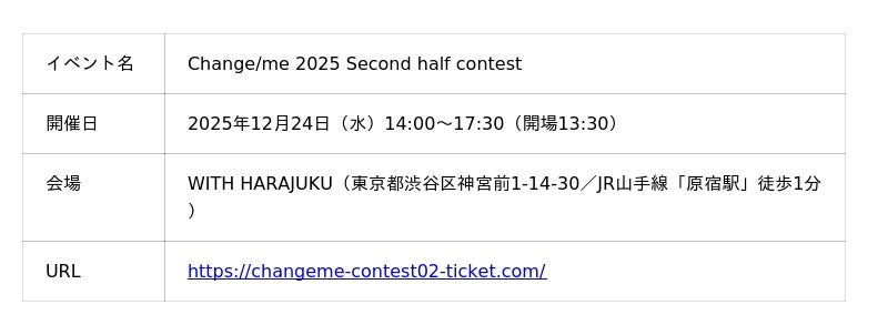 その第一歩として、2025年12月24日(水)に東京・原宿のWITH HARAJUKUで開催される「Change/me 2025 Second half contest」に、特別審査員として登壇します。