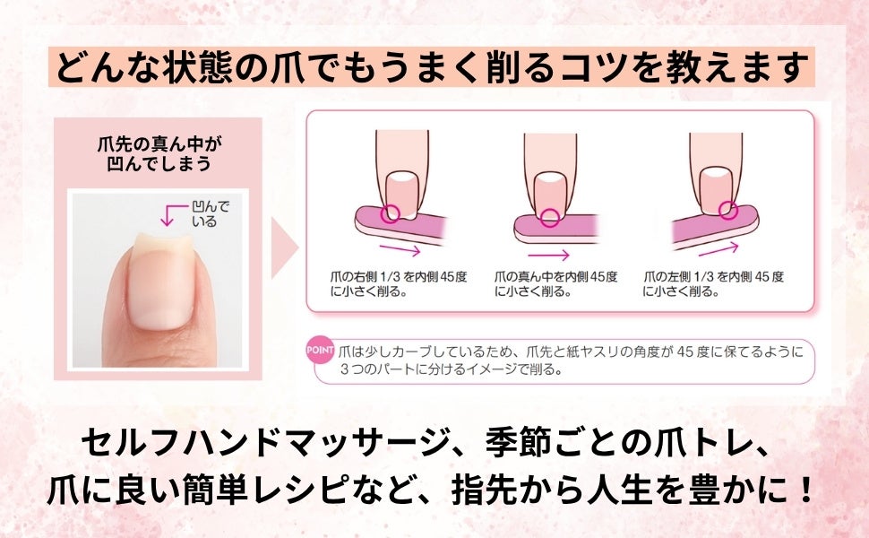 爪を健康に育てる3原則/理想の爪の形7つの特長/おすすめしない6つの爪の形/爪を削るための道具と種類/紙ヤスリの使い方/爪の削り方/ネイルオイルの選び方・塗り方/ベースコートの選び方・塗り方/除光液の選び方・爪に負担をかけないオフの仕方/甘皮のケア ほか