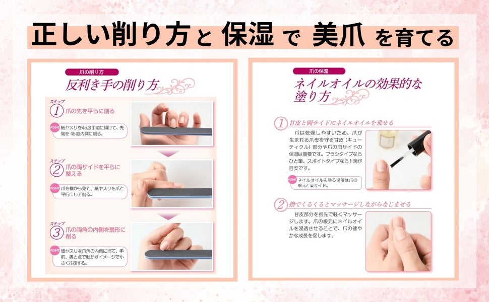 ささくれ/二枚爪/割れやすい爪/薄い爪/爪の縦筋・横筋/爪表面の凸凹/反り爪/小さな爪/爪先の乾燥/噛み爪/赤ちゃんや子ども・高齢者の爪のケア ほか