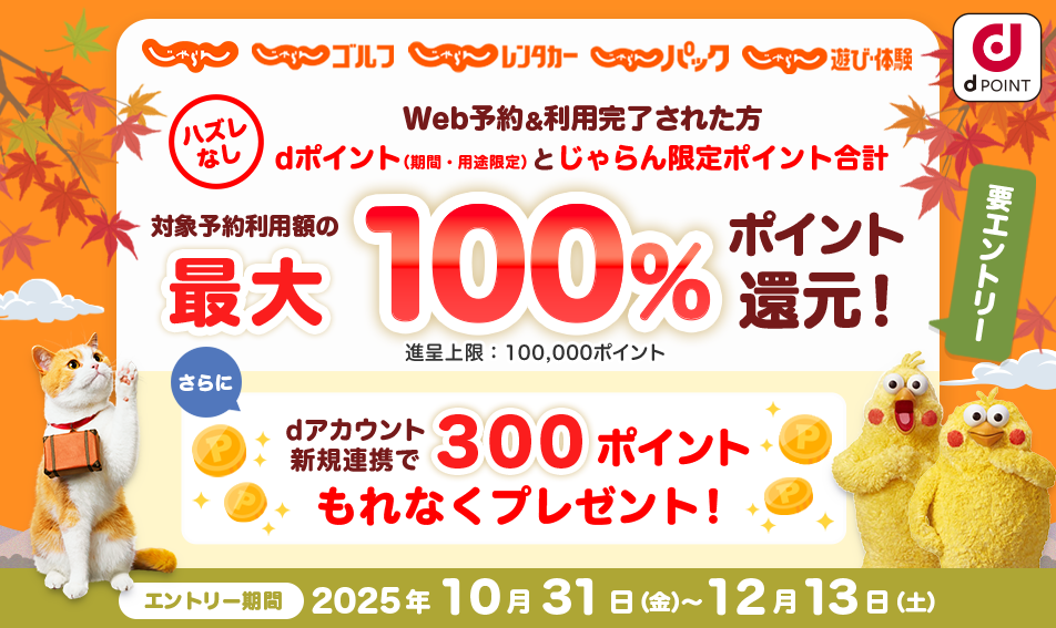 株式会社NTTドコモ(以下、ドコモ)は、じゃらんnetにおいて、「最大全額ポイント還元キャンペーン(以下、本キャンペーン)」を2025年10月31日(金)から2025年12月13日(土)まで開催いたします。