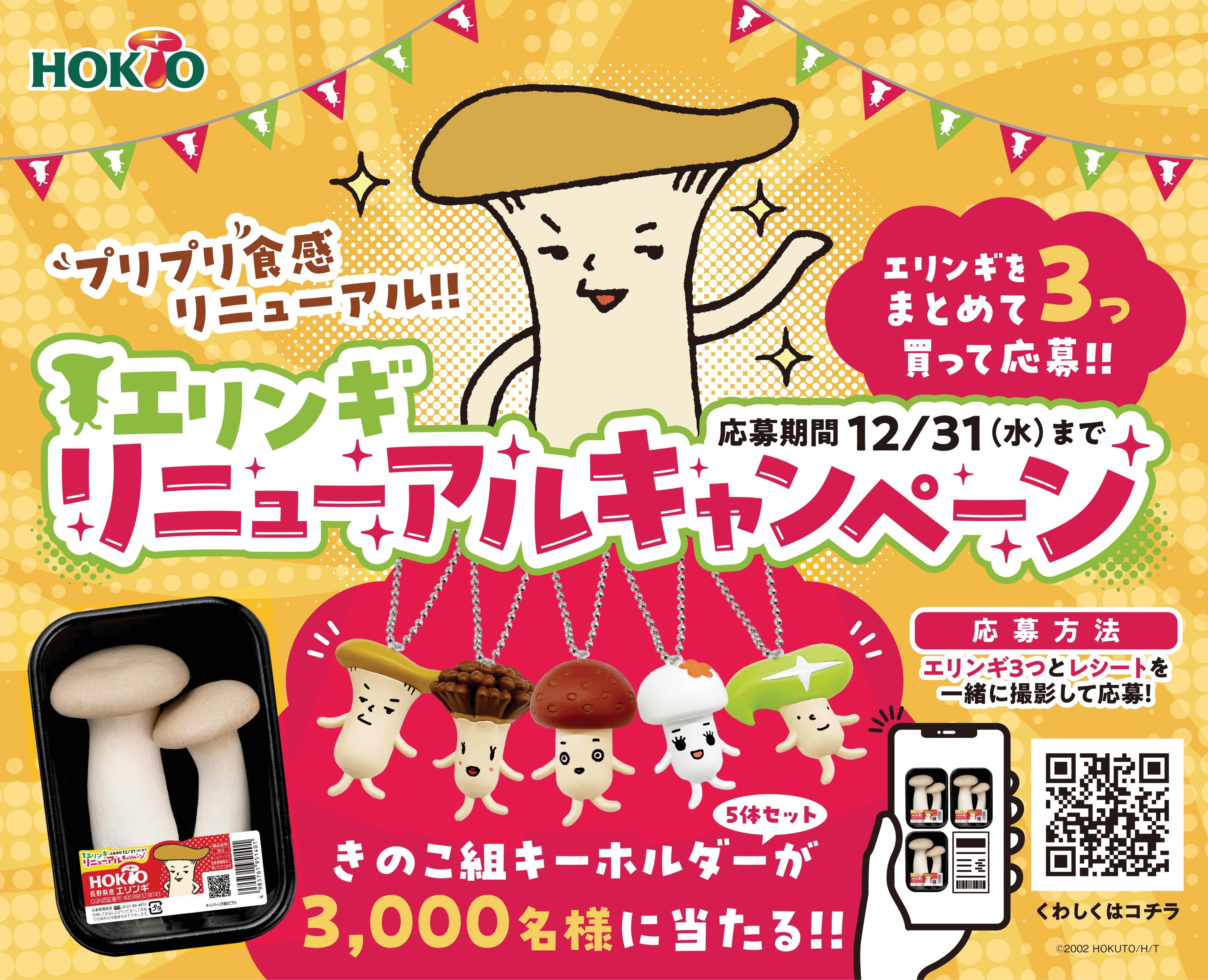 新エリンギ発売を記念して、エリンギをまとめて3つ買って応募するときのこ組キーホルダー(5体セット)が当たるキャンペーンを実施します。