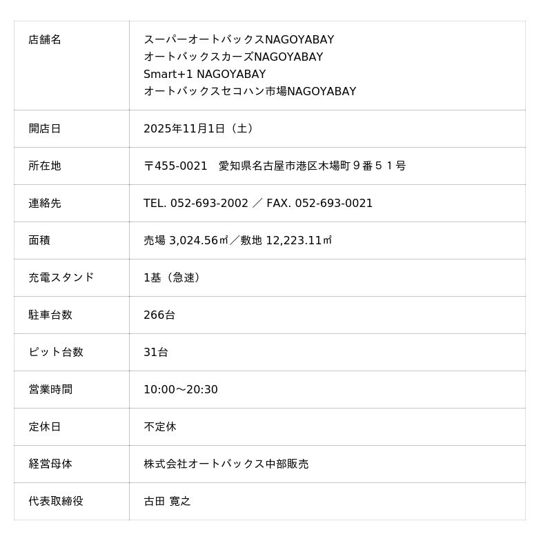 株式会社オートバックスセブン(代表取締役 社長:堀井勇吾)と加盟店契約を結んでいる株式会社オートバックス中部販売(代表取締役:古田寛之)は、2025年11月1日(土)に「スーパーオートバックスNAGOYABAY」をリニューアルオープンいたします。併設店の「オートバックスカーズNAGOYABAY」もリニューアルし、「Smart+1 NAGOYABAY」「オートバックスセコハン市場NAGOYABAY」が新規オープンいたします。
