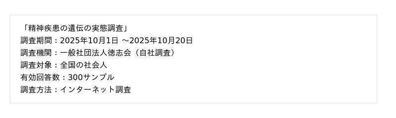 一般社団法人徳志会は、全国の社会人を対象に精神疾患の遺伝に関するアンケート調査を実施しました。