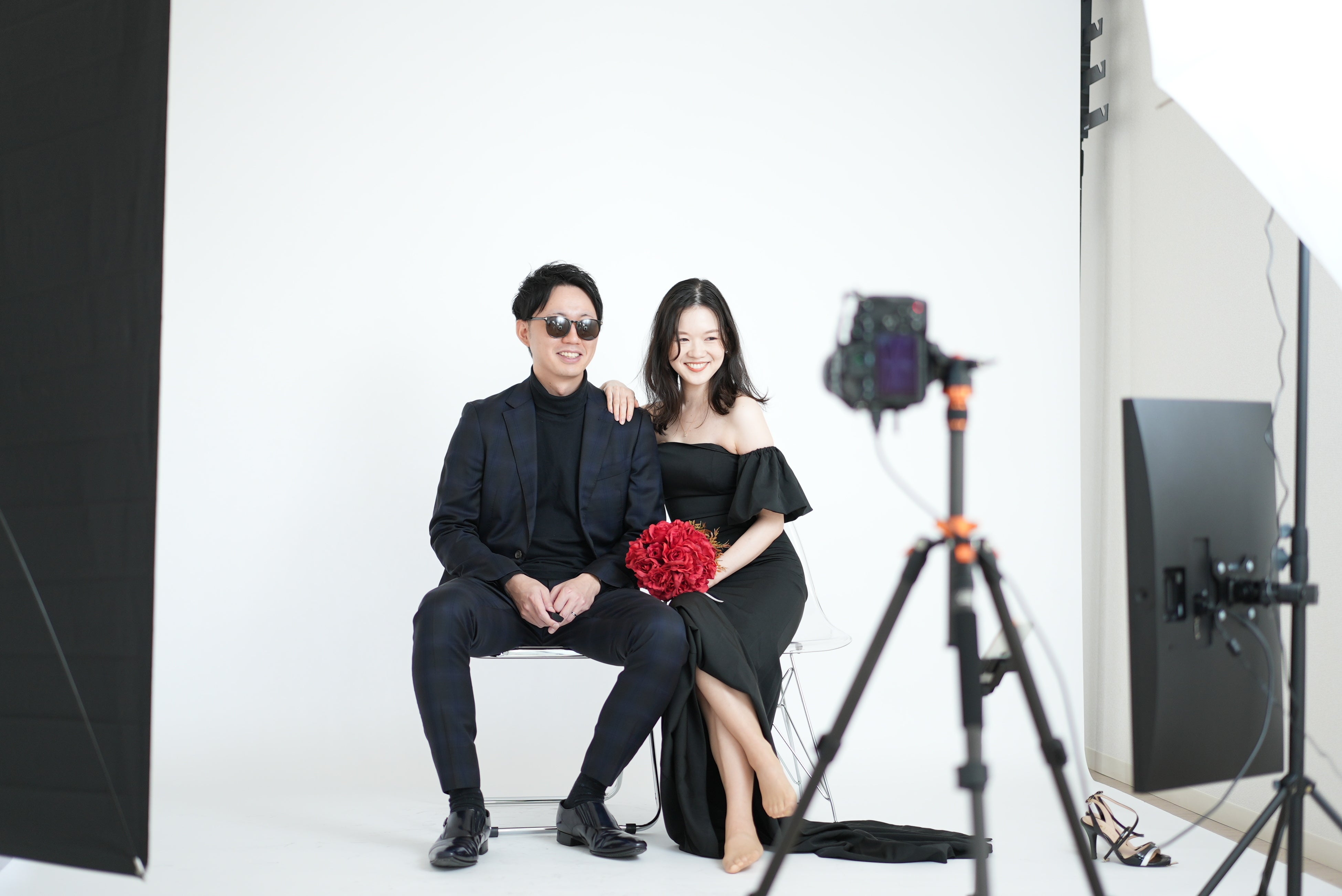 完全貸切スタジオでライト調整 → セルフ撮影(スタッフがライト・構図・ポーズをサポート)※セルフ撮影が難しいという場合はスタッフが撮影サポートいたします