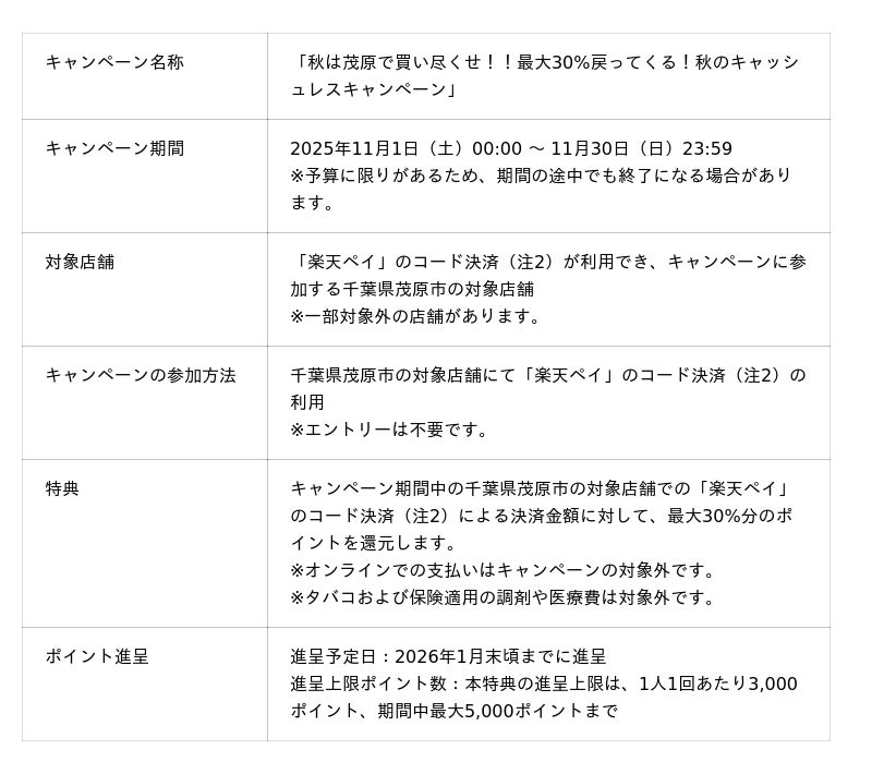 楽天ペイメント株式会社(以下「楽天ペイメント」)は、運営するキャッシュレス決済サービス「楽天ペイ」において、千葉県茂原市が2025年11月1日(土)から11月30日(日)まで実施する「秋は茂原で買い尽くせ!!最大30%戻ってくる!秋のキャッシュレスキャンペーン」に参加することをお知らせします。