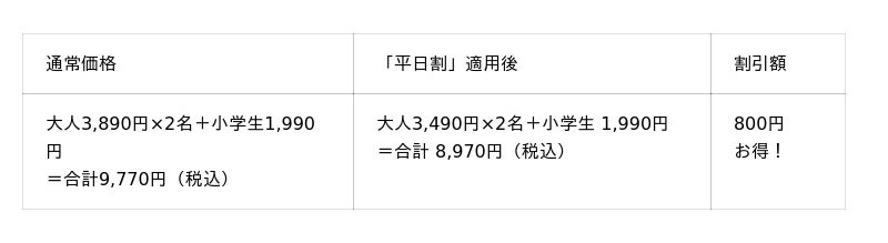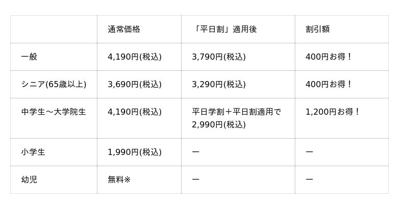 ※「平日割」の対象は一般・シニア料金のお客様です。※「平日割」・「平日学割」はキャンペーン開催期間中の土日・祝を除く平日のみが割引適用となります。※幼児は保護者1名様につき幼児2名様まで。3名様以上は1名様につき990円(税込)頂戴いたします。※学割は学生証ご提示の本人に限り有効です。
