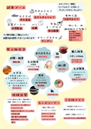 当日は、生活クラブと提携する23の生産者・団体が集結し、国産中心・添加物削減・減農薬などにこだわった食材や生活用品などを紹介します。会場では、国産牛肉、天然酵母パン、豆腐ドーナツ、牛乳・ヨーグルト、焼きそばなどの試食が多数お楽しみいただけます。また、地元の店舗によるハンドメイドの雑貨やお菓子の販売、毎回好評の「10円フリーマーケット」、親子で楽しめるワークショップなどのキッズコーナー、靴・メガネ・真珠・婦人服などの展示即売会も同時開催します。