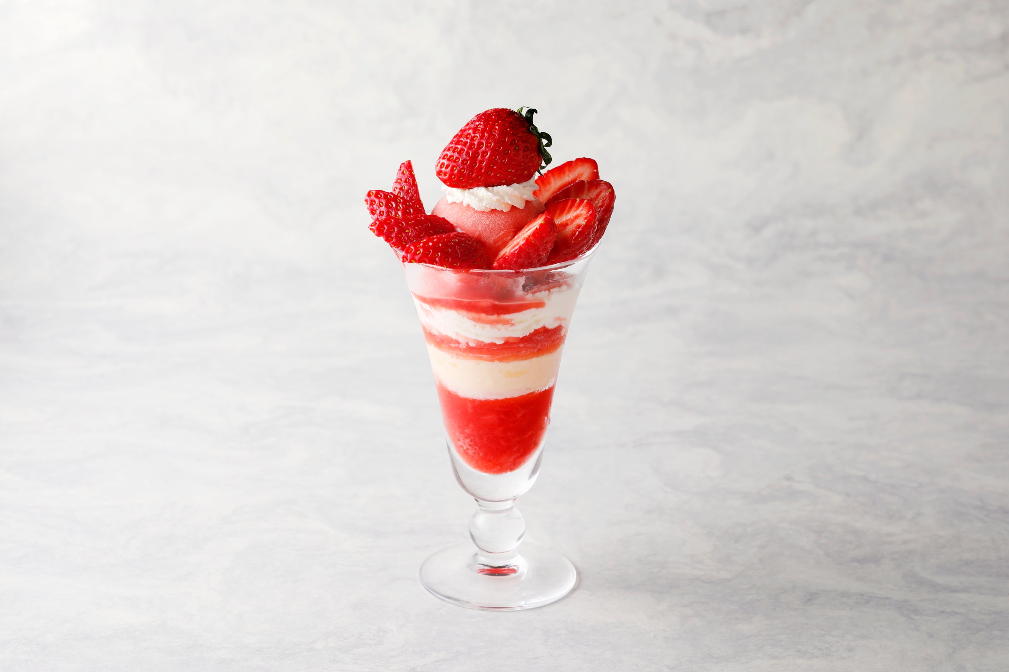◆滋賀県産苺“虹の果”のパフェ 琵琶湖近くで水耕栽培によって育てられたブランド苺「虹の果」。甘味と酸味のバランスが絶妙で、冬の苺にも劣らない味わいです。