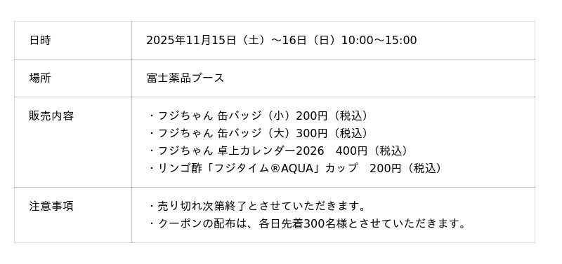 富士薬品ブースを出展し、キャラクターさみっと初参加記念として、初の「フジちゃん」オリジナルグッズの販売を行うほか、富士薬品の人気リンゴ酢飲料「フジタイム(R)AQUA」の販売を行います。何か一つでもご購入いただいた方には、会場近隣のセイムスで使用できるクーポン券をプレゼントします。また、ブースではお子様向けにフジちゃんの塗り絵もご用意していますので、お気軽にお立ち寄りください。