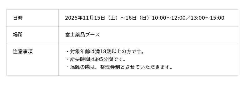 富士薬品のブースでは、「セイムス」の管理栄養士によるプチ健康相談会を行います。血管年齢測定器を使用して、その場で血管年齢をチェックし、結果に応じて、管理栄養士が健康維持のポイントをアドバイスします。
