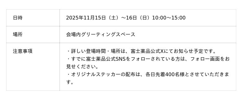「フジちゃん」が会場内を練り歩く際、写真撮影やふれあいをお楽しみいただけます。その場で富士薬品の公式X(https://x.com/fujiyakuhin_PR)もしくは公式Instagram(https://www.instagram.com/fujiyakuhin_pr)をフォローしていただいた方には、キャラクターさみっと限定のオリジナルステッカーをプレゼントします。