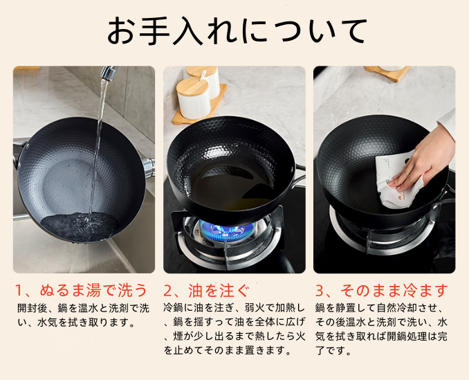 この処理により、SWISS MILITARY 中華鍋は通常の鉄製鍋よりも錆びにくく、硬度が大幅に向上し、耐久性も高まり、長期使用に耐えます!