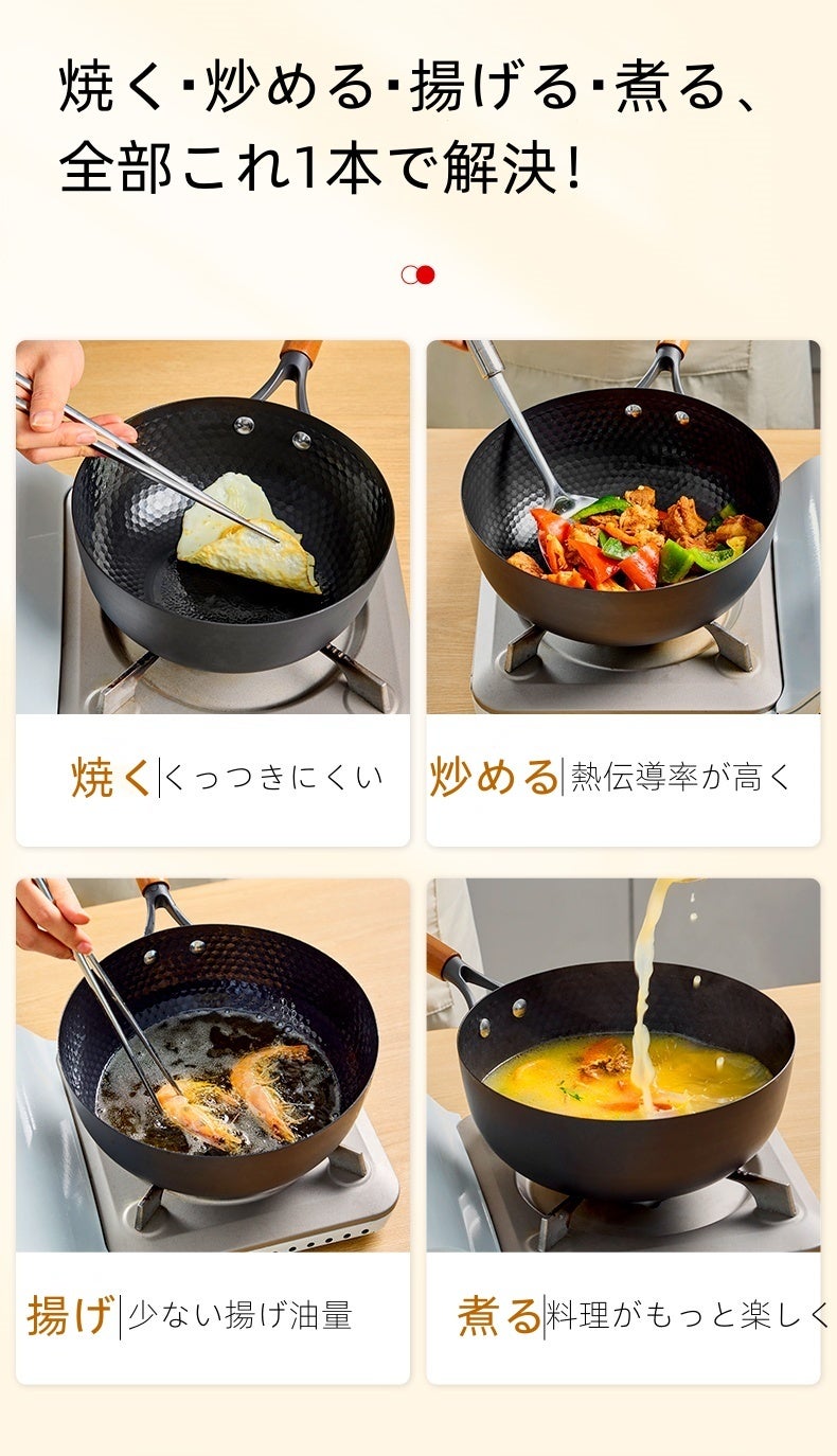 炒めるだけでなく、煮る・揚げる・焼くなど、さまざまな調理法に対応。