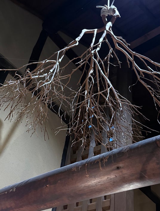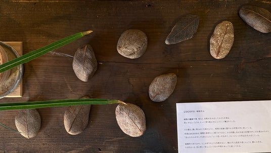 NIJIRIの玄関では、西岡さんとcocoroさんによる共同作品が展示され、通り庭の吹き抜けには、cocoroさんの〈石に葉脈を貼り付けた作品〉が静かに佇みました。