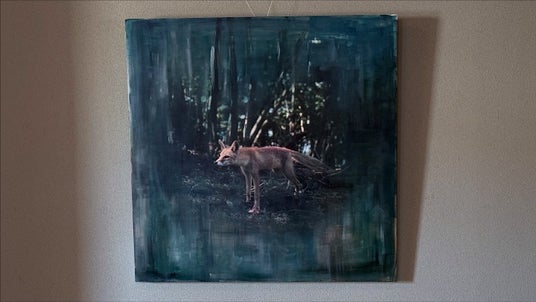 西岡さんの作品は、木製パネルに写真を転写し、その上からドローイングを施すという独自の技法で構成されています。