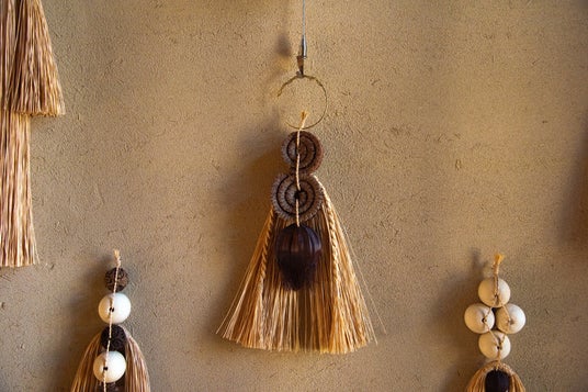 和室の空間に自然と溶け込むこれらの作品は、麦わら帽子にも使われる素材〈ラフィア〉を中心に構成されており、野生的でありながらもどこか文明的な佇まいを見せています。