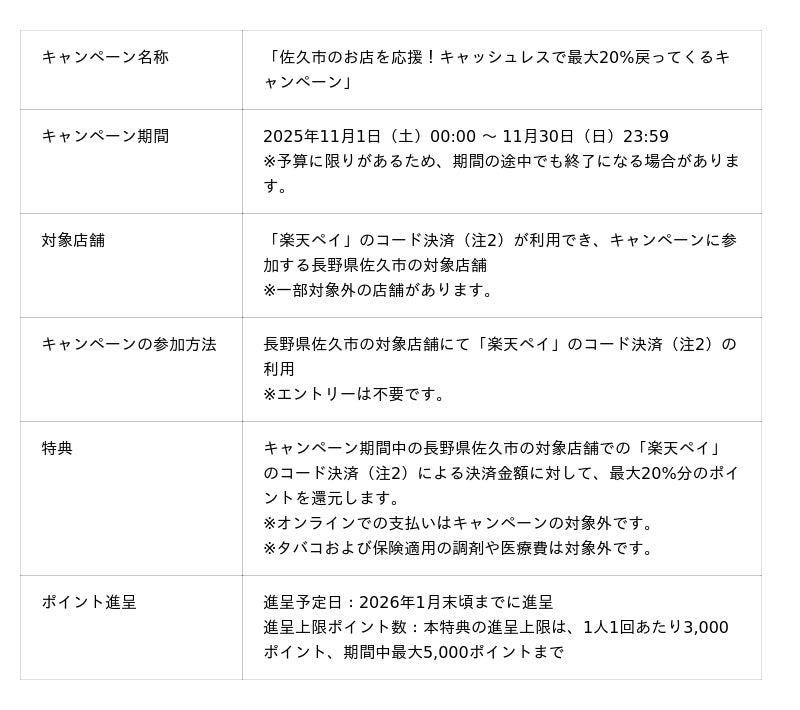 本キャンペーンでは、長野県佐久市の対象店舗(注1)において、キャンペーン期間中に「楽天ペイ」のコード決済(注2)を利用した方を対象に、決済金額に対して最大20%分の「楽天ポイント」を還元(注3)します。
