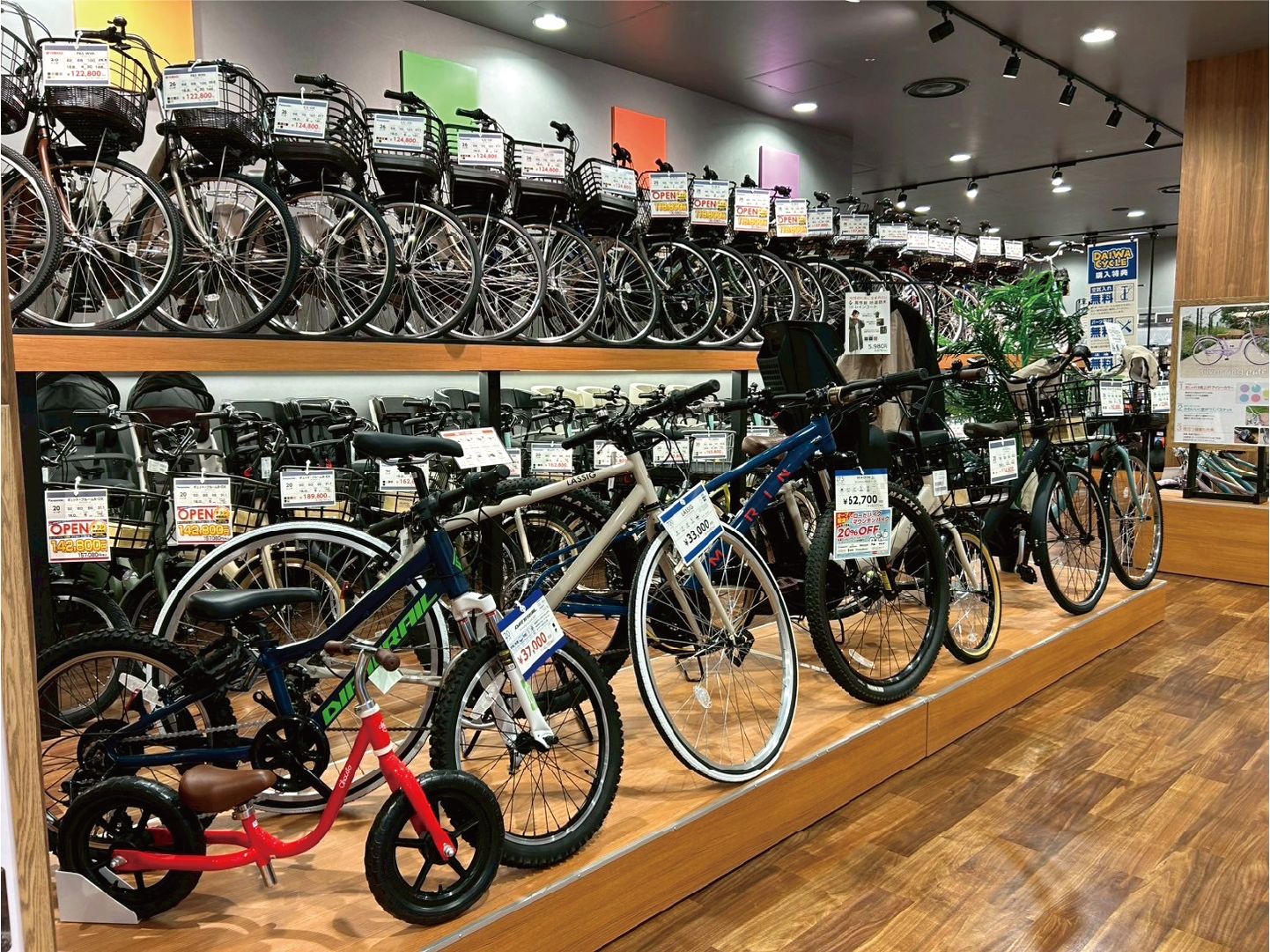 ダイワサイクルSTYLEららぽーとTOKYO-BAY店は北館1階のフロアにある店舗で、電動アシスト車、シティサイクル、スポーツサイクル、ミニベロ・折畳車、子供車と幅広い年齢の方に向けた自転車をご用意いたしております。お子様と同乗可能なチャイルドシート付き電動アシスト自転車から、初心者にもオススメのスポーツバイクまで200台以上の多様な自転車を展示しております。試乗も可能となっておりますので、お気軽にスタッフにお声がけください。