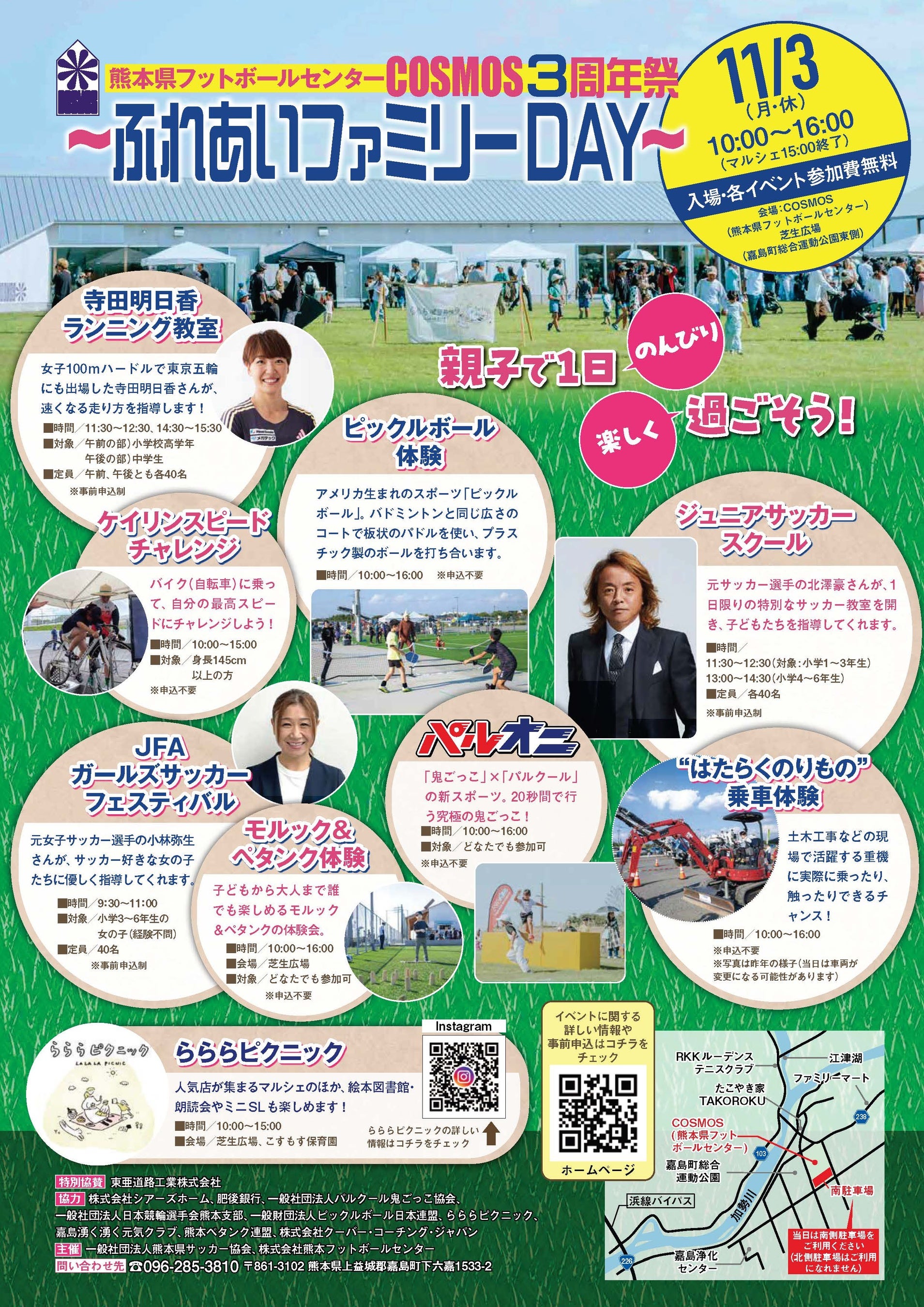 COSMOS3周年イベント開催!2025年11月3日(月・祝)にCOSMOS(熊本県フットボールセンター)3周念を記念した、ご家族やご友人、地域の皆様、サッカーファミリーの多くの方に楽しんでもらえるイベントを開催します!