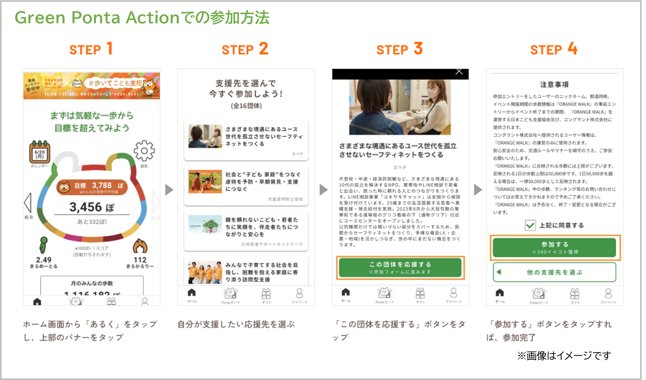LMが運営するアプリ「Green Ponta Action」もしくは、コングラント株式会社のアプリ「minpo」から参加することができます。アプリ「Green Ponta Action」では、ホーム画面の「あるく」から、特設サイトにアクセスして応援したい団体を選び、参加フォームに入力するとエントリー完了となります。参加いただいた方にはもれなく300イイコト(アプリ内のスコア)をプレゼントします。全国どこからでも、オンラインチャリティウォークに参加いただけます。