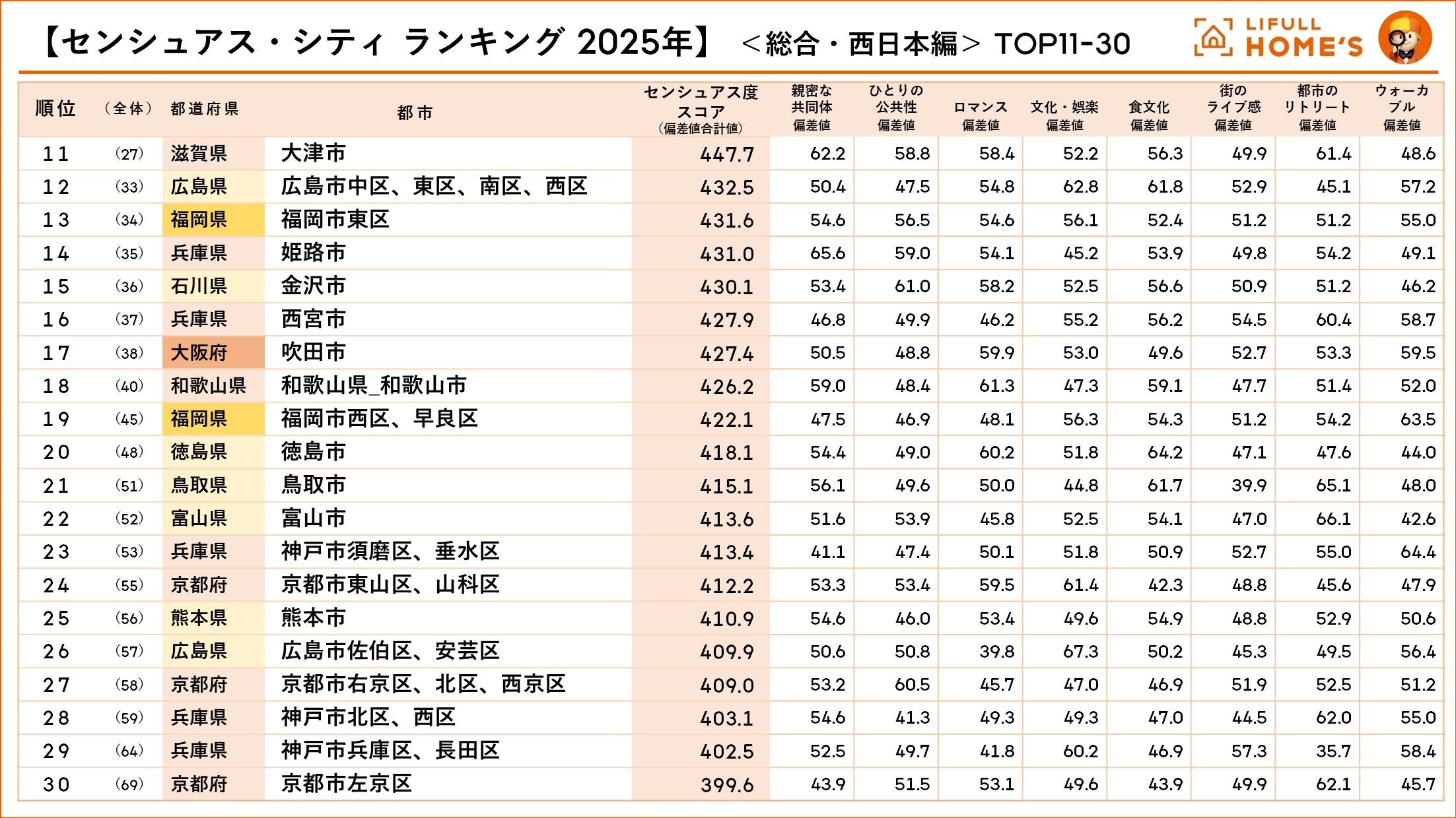 LIFULL HOME'S総研 「センシュアス・シティランキング2025年 総合・西日本編」TOP11~30