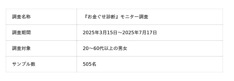 今回の「お金ぐせ診断」の分析は、20代から60代以上の男女、幅広い職業層505名を対象に属性を均等に割り振り行いました。その全体結果の58.0%が「渋りすぎ」タイプと診断され、日本人のお金への慎重な姿勢が浮き彫りになりました。