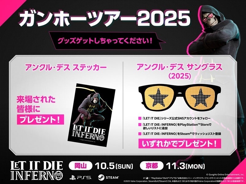 会場では、『LET IT DIE』シリーズの水先案内人である「アンクル・デス」のステッカーやオリジナルサングラスをゲットできます。