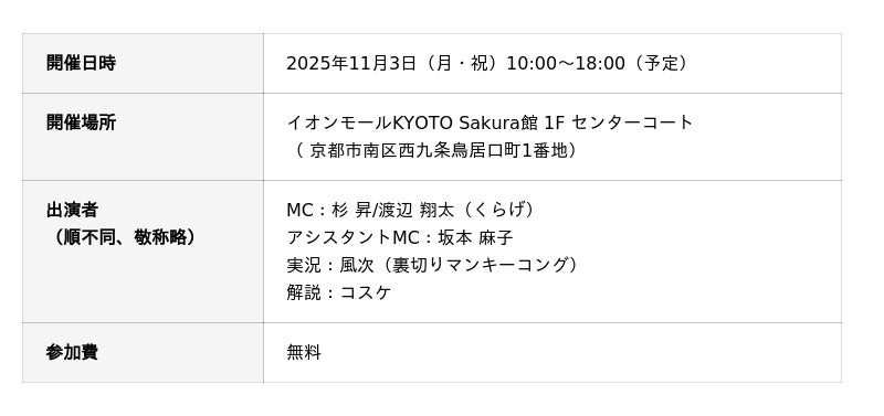 「ガンホーツアー2025」は入場無料でどなたでもご参加いただけます。一部大会は当日参加も可能です。ご家族やお友達とお誘いあわせのうえ、「ガンホーツアー2025」のフィナーレを飾る京都会場へぜひご来場ください。