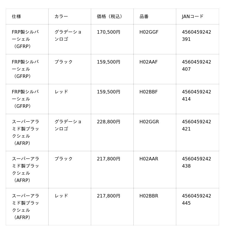 - FRP製シルバーシェル(GFRP)/スーパーアラミド製ブラックシェル(AFRP)