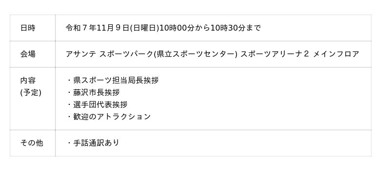 選手団の歓迎を県と藤沢市が行います。(どなたでも観覧できます。事前申込不要・観覧無料)