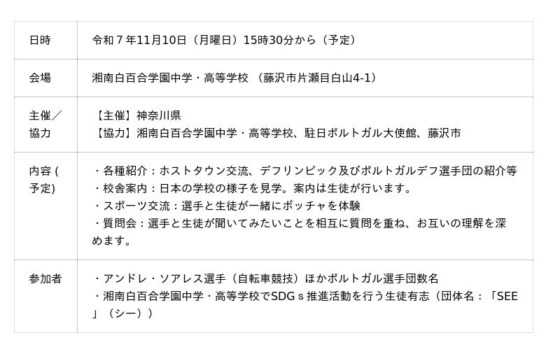 県は、東京2020大会でポルトガル共和国のホストタウンとなり、ポルトガル・パラリンピック選手 団の事前キャンプを受け入れました。同国とは今日まで交流を続けています。今年のホストタウン交流は、事前キャンプに合わせて実施します。昨年12月にオンライン交流をしたアンドレ・ソアレス選手をはじめ、選手団数名と湘南白百合学園の生徒の皆さんが、交流を深めます。(会場校の生徒以外は参加できません。)