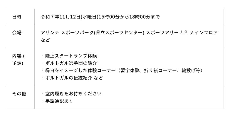 ポルトガル選手団の皆さんを歓迎するため、交流イベントを実施します。ポルトガル選手団とふれ合い、楽しく異文化交流します。(どなたでも参加できます。事前申込不要・参加無料)