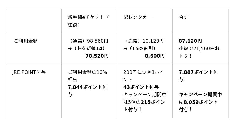 本プランは、東日本旅客鉄道株式会社(JR東日本)が提供する「えきねっと」の「JRきっぷ」チケットレス商品(指定席)をご予約のうえ、駅レンタカーを「えきねっと+駅レンタカープラン neo」のプランでお申し込みいただくと、チケットレス商品の10%(最大18%)相当のJRE POINTが付与され、さらにレンタカー料金も通常価格の15%割引となる大変おトクなプランです。【JRE POINT付与例】