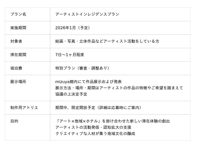株式会社京都丹後企画(本社:京都府与謝郡与謝野町、代表:濱田 祐太)は、宮津駅前に本年5月にオープンした全9室のブティックホテル「 mizuya(みずや)」にて、2026年1月よりアーティストの創作活動を応援する特別滞在プラン「アーティストインレジデンスプラン」を開始します。