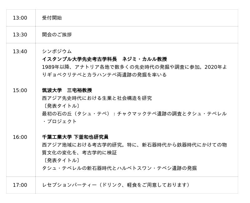 11月7日(金)には、ターキッシュエアラインズの後援のもと、アナトリア考古学に精通する専門家を招いた招待制シンポジウム「大いなる転換の地~タシュテペレル~」を開催します。本シンポジウムでは、先史時代の社会的変化や定住生活への移行など、タシュテペレルの重要性について深く学ぶことができます。