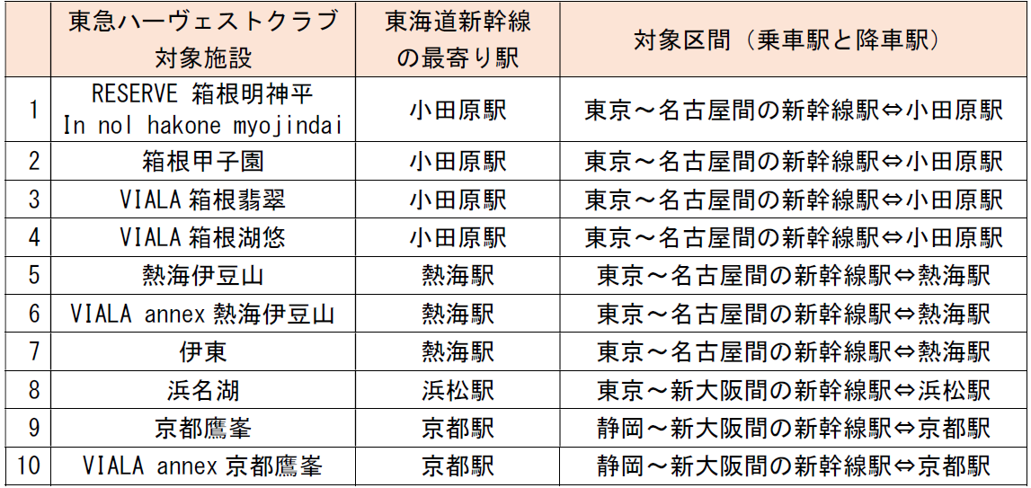 【東急ハーヴェストクラブ対象施設および対象区間】