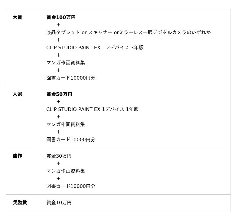 B4サイズのマンガ用原稿用紙に、インクまたは墨汁で描いてください(ただし、ふきだし内のセリフは鉛筆で書いてください)。また、データ(CG作品など)による応募も受け付けます。その際にはプリントアウトと共に、使用OS・アプリケーション名などを明記してください。「紙原稿の応募」「デジタル原稿のWEB応募」それぞれの詳細については応募サイトをご確認ください。