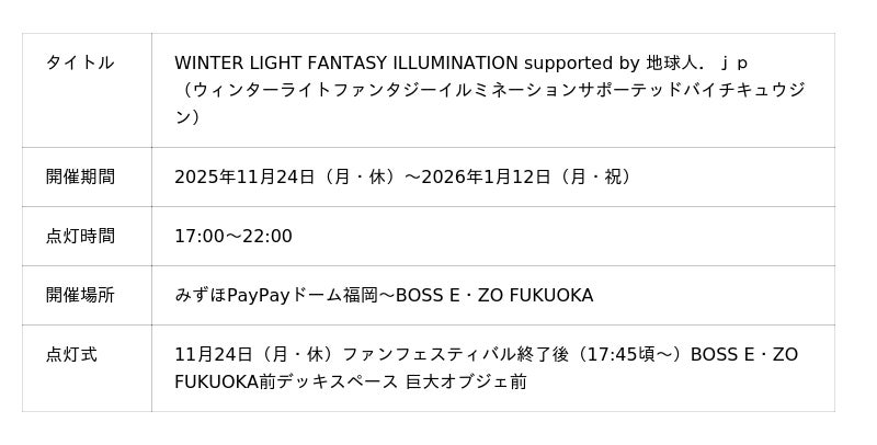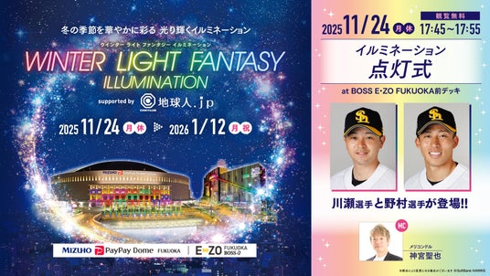 約20万球の光に包まれ、美しく輝くイルミネーション「WINTER LIGHT FANTASY ILLUMINATION supported by 地球人.jp」を11月24日(月・休)~2026年1月12日(月・祝)の期間限定で開催!みずほPayPayドームからBOSS E・ZO FUKUOKAにかけて幻想的な空間が広がります。イルミネーション初日となる11月24日(月・休)にBOSS E・ZO FUKUOKA前デッキスペースで点灯式を実施します。点灯式のMCは福岡よしもと所属メリコンドルの神宮聖也さんが務め、ホークス選手が登壇予定です。この冬だけの特別な夜を、ぜひお楽しみください☆