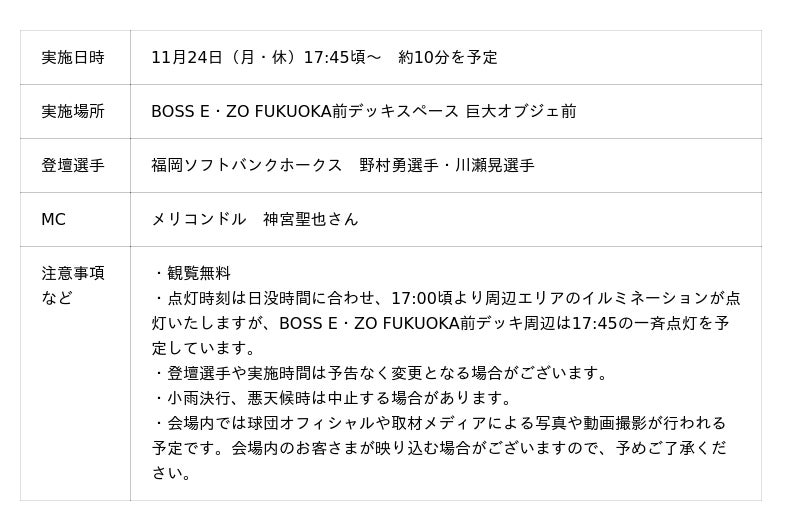 BOSS E・ZO FUKUOKA前デッキにて、イルミネーション点灯式を開催。ホークス選手と一緒に特別な瞬間をお楽しみください☆